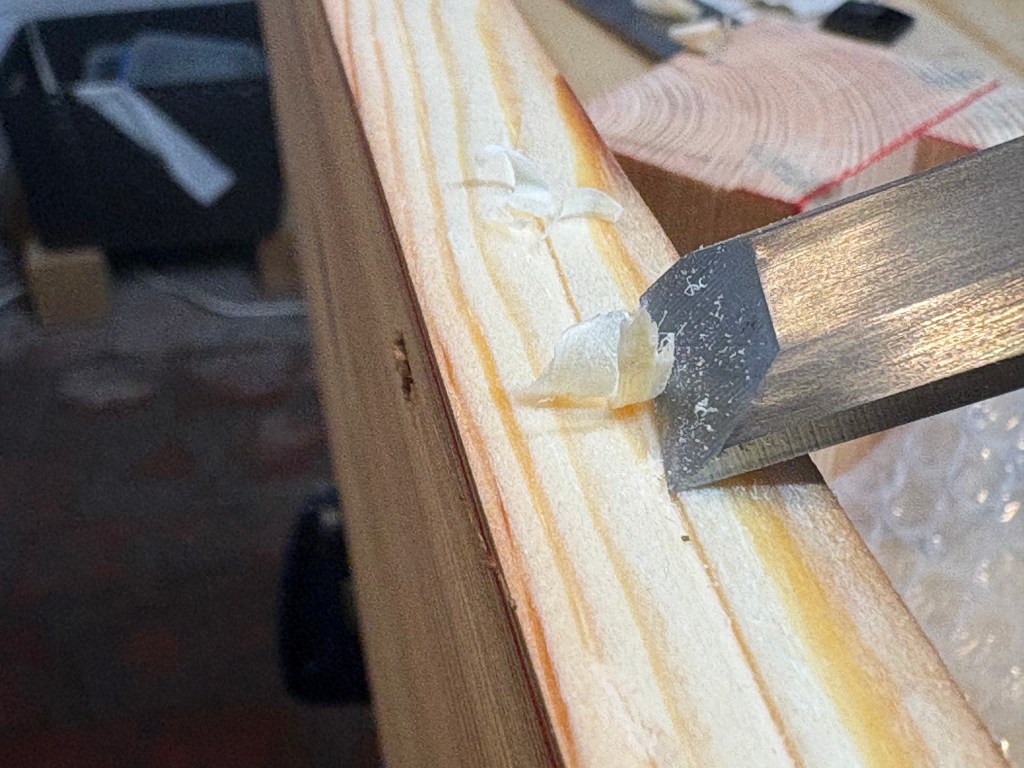 Originally, I wanted to trim the edges of the woods with chisels, but after a week, I lost my patience and recognised the limitations of my skill – I eventually used a canna to plane them.